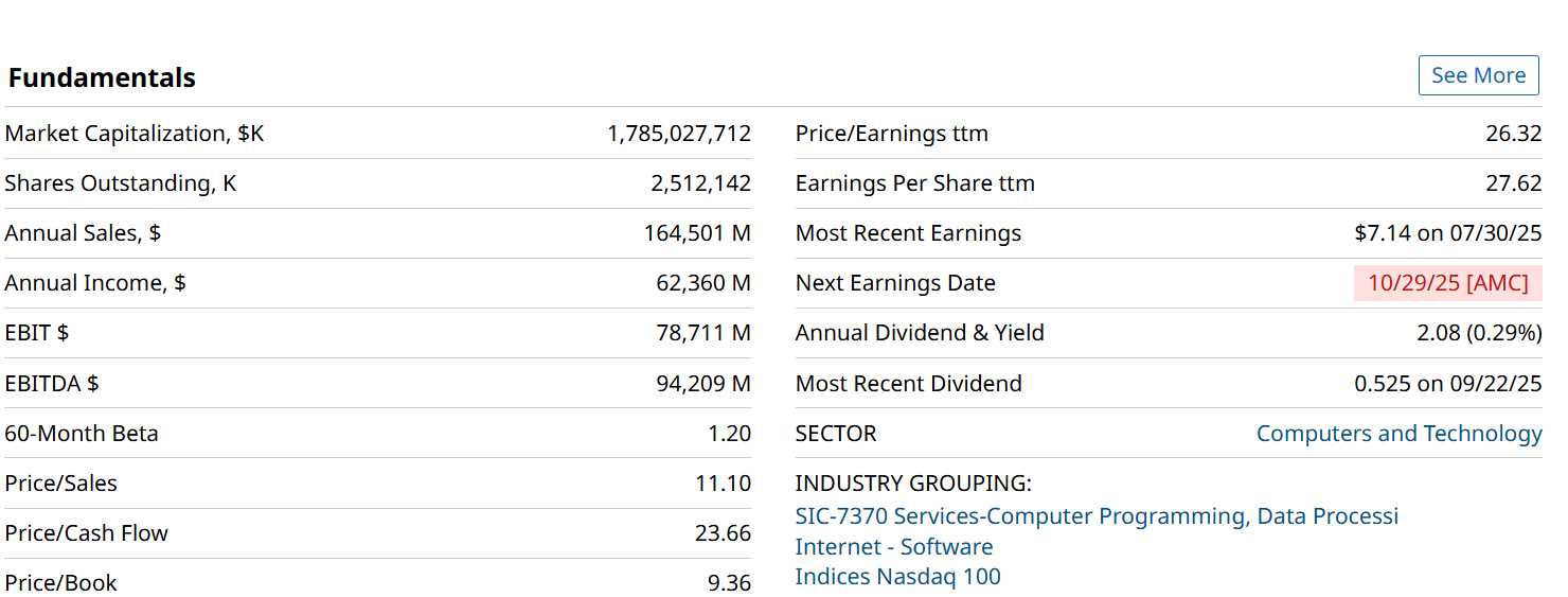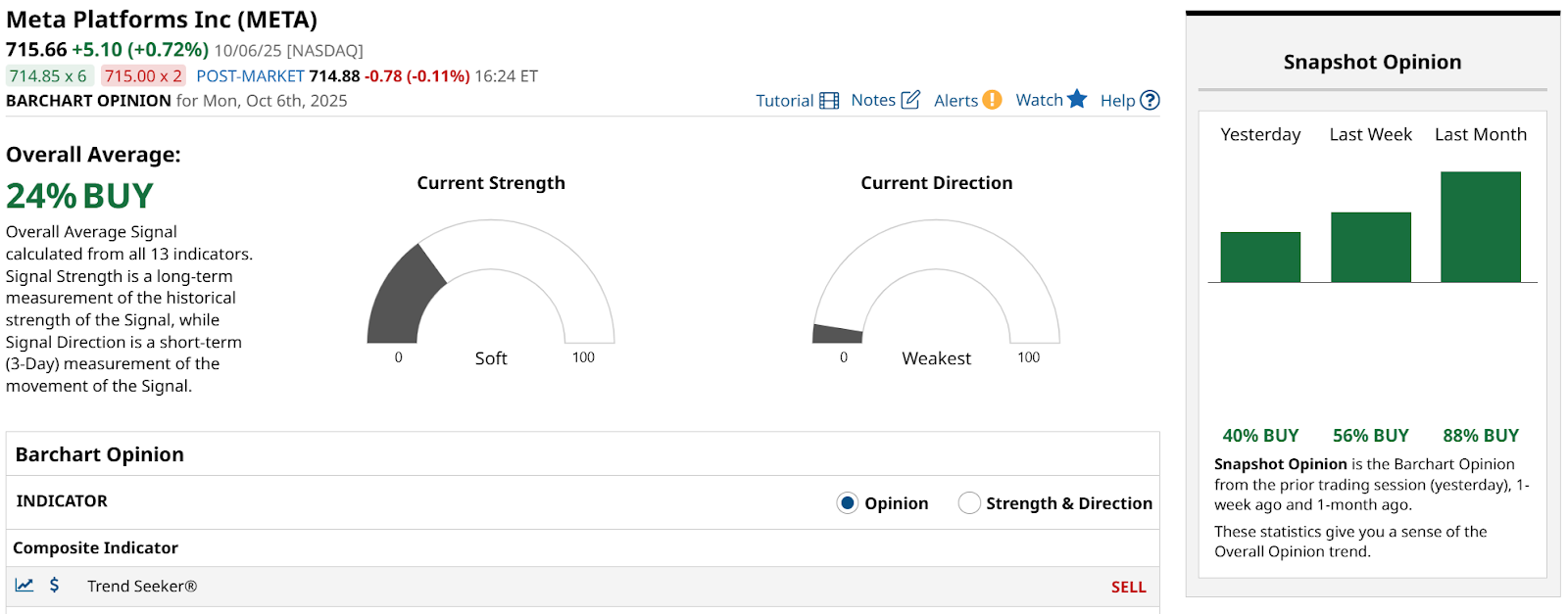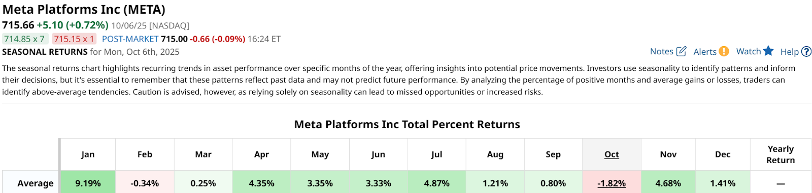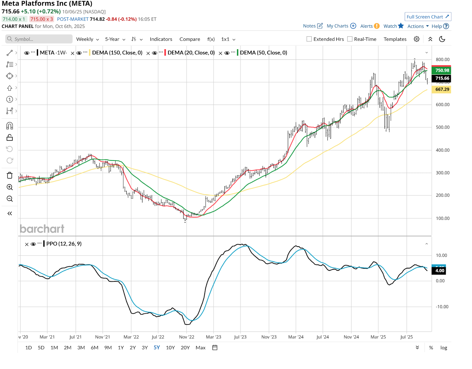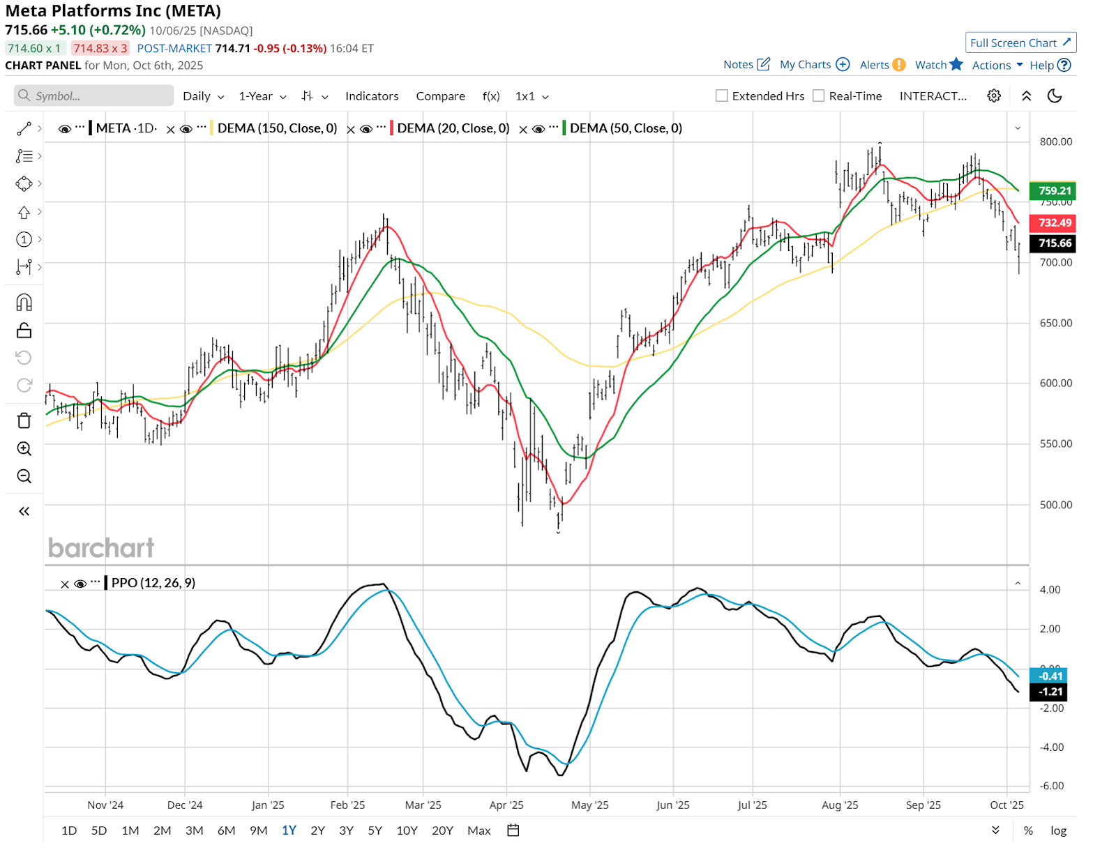 META to me appears to be in transition from “not bad” to “be very careful.” Here’s the daily chart, which shows the 20-day moving average starting to tank. That’s the first thing that typically hits my radar, beyond the general shape of the chart itself. ![]() Why META’s Stock Chart Worries Me Right NowThat $700 price area, about 2% below Monday’s close, is a possible landing spot for the stock. Indeed, it traded down to $690 intraday. And there’s a round number at the top of META’s price history too, as it topped out just below $800 in mid-August. But at the margin, I see a new risk of that soft support breaking just below Monday’s low, which could instantly bring that 2025 low into play. That’s way down at $500. The weekly look below only adds to my concerns with this stock, at least technically. The 20-week moving average (in red) is in the process of rolling over, and the 50-week (green line) is just hanging on. More significantly, that Percentage Price Oscillator (PPO) indicator is tenuous at best. It is hard to deny that there’s selling pressure underway here. Earnings are about three weeks away, so there’s a lot of time for the stock to fade into that event, before the market gets to react to another fresh quarterly report from Mark Zuckerberg’s company. ![]() META sells at 26x trailing earnings, not outrageous in today’s market. But I can’t say the same about that 11x sales figure. ![]() Returning to the technical picture for META, I note that while the stock is a “Buy” using Barchart’s 13-part Barchart Opinion indicator which covers three separate time frames, that 24% mark you see at left in green is lower than it was a week ago. And that latter mark is lower than a month ago. In my experience with this system, that’s not a good sign. It is also why ratings like “buy” and “sell” always need more explanation and context, as you see below. ![]() I’m not much of a “seasonality” investor, but I will note that META’s worst month historically is October. And by a noticeable margin. ![]() Wall Street analysts like the stock, even if I don’t. But really, are there many stocks Wall Street doesn’t like after a move like META has had? To say that group are bandwagon-jumpers puts it mildly. META: More Risk Than RewardStocks like META have had a “halo effect” for a long time. They are the quintessential buy-the-dip candidates for so many types of investors, including the powerful algorithms that have such influence on daily trading now. But while you can never count out an iconic stock like this one, I conclude it is more risk than is worth it at this moment. On the date of publication, Rob Isbitts did not have (either directly or indirectly) positions in any of the securities mentioned in this article. All information and data in this article is solely for informational purposes. For more information please view the Barchart Disclosure Policy here. |