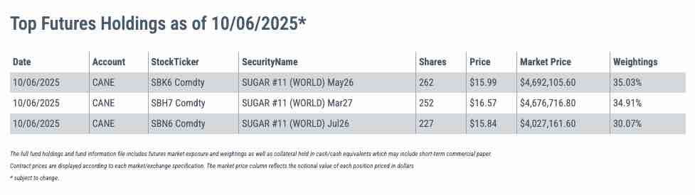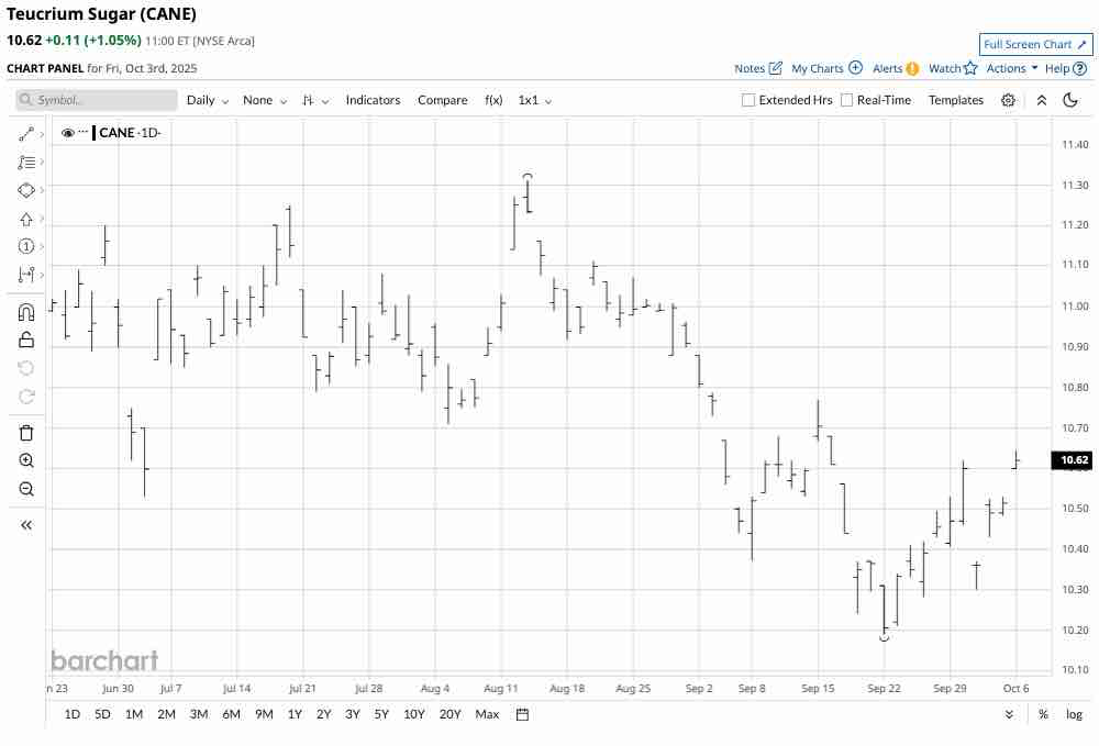 Sugar could be priced attractively at 16.50 cents per pound at the March 2026 futures price in October 2025. Futures are the most direct route for sugar exposureThe most direct route for a risk position in the world sugar market is the futures trading on the Intercontinental Exchange. At 16.72 cents per pound, each March futures contract containing 112,000 pounds of the sweet commodity has a $18,726.40 per contract value. The original margin requirement on a contract of ICE world sugar #11 is $1,071, translating to 5.7%. If the equity on a long or short position moves below $974 per contract, ICE requires maintenance margin payments. Sugar futures are leveraged, as market participants can control each contract for a 5.7% down payment. Meanwhile, unlike other soft commodities, the ETF market offers an alternative to futures for market participants seeking price exposure in the world sugar market. The CANE ETF tracks a portfolio of ICE sugar futuresThe Teucrium Sugar ETF (CANE) owns a portfolio of three actively traded ICE world sugar futures contracts, excluding the nearby contract. While the March 2026 contract is currently the active month, CANE’s top holdings include: ![]() As the chart shows, CANE owns the ICE world sugar futures contract for May 2026, July 2026, and March 2027 delivery. The most price variance tends to occur in the nearby contract as it attracts the most hedging and speculative activity. Therefore, CANE tends to underperform the nearby contract on the upside and outperform during downside price corrections. CANE does not own the nearby contract to mitigate roll risk in the volatile sugar futures market. The most recent rally in the continuous ICE sugar futures market took the price 8.7% higher from 15.51 on September 5 to 16.86 on September 15, 2025. ![]() Over around the same period, CANE rose 3.9% from $10.37 to $10.77 per share. ICE sugar futures then declined 6.5% from 16.86 to 15.76 cents, while CANE fell 5.4% from $10.77 to $10.19 per share. Over around the same period, CANE rose 3.9% from $10.37 to $10.77 per share. ICE sugar futures then declined 6.5% from 16.86 to 15.76 cents, while CANE fell 5.4% from $10.77 to $10.19 per share. On the date of publication, Andrew Hecht did not have (either directly or indirectly) positions in any of the securities mentioned in this article. All information and data in this article is solely for informational purposes. For more information please view the Barchart Disclosure Policy here. |