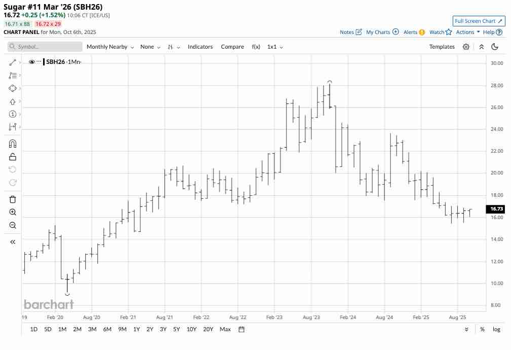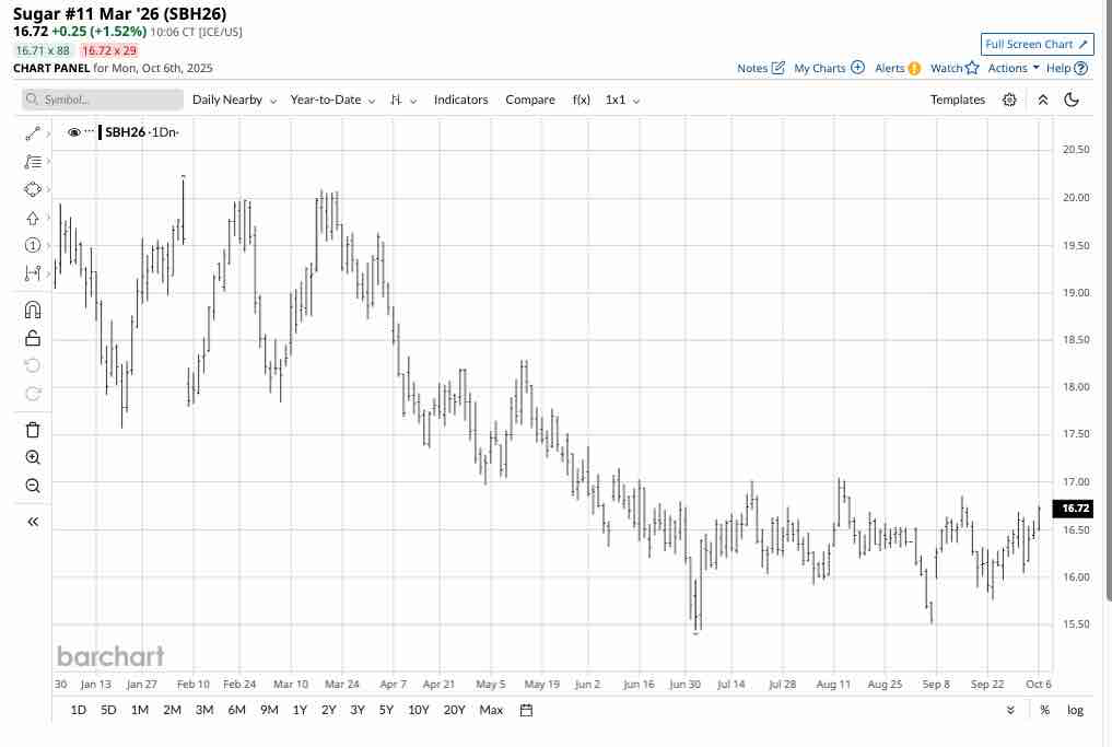 Can Sugar Rally?![]() World sugar futures on the Intercontinental Exchange moved 4% higher in Q3 2025 but were 16.4% lower over the first nine months of this year, settling at 16.10 cents per pound on September 30, 2025. In an August 5 Barchart article on the sugar futures market, I concluded with the following: